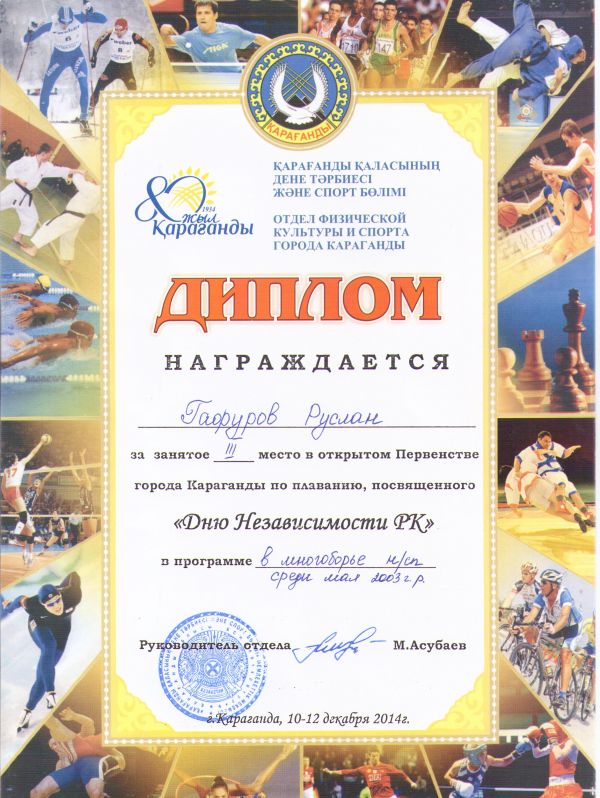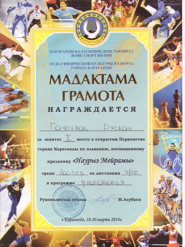 Гафуров Руслан награжден грамотой за занятое 2 место в открытом Первенстве города Караганды по плаванию, посвященному празднику "Наурыз Мейрамы"