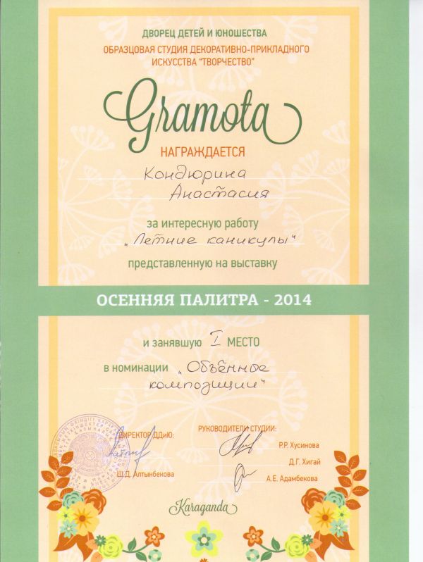 Кондюри Анастасия награждается за интересную работу "Летние каникулы" представленную на выставку Осенняя палитра - 2014 и занявшую 1 место в номинации "Объемные композиции"