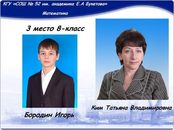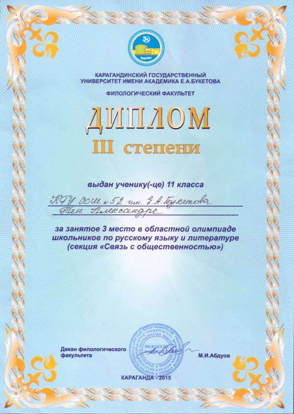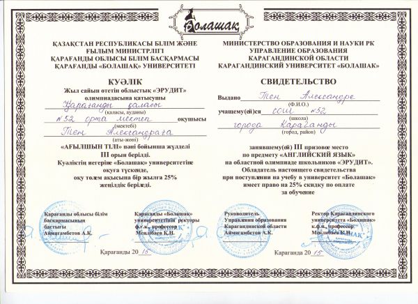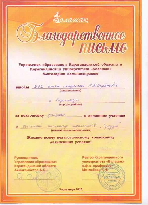 Управление образования Карагандинской области и Карагандинский университет "Болашак" благодарит администрацию "СОШ №52 имени академика Е.А. Букетова" за за подготовку учащихся и…