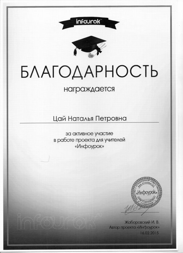 Цай Наталья Петровна получает благодарность за подготовку Тен Александры-призера областной олимпиады школьников по русскому языку и литературе.