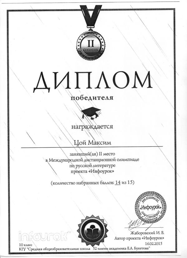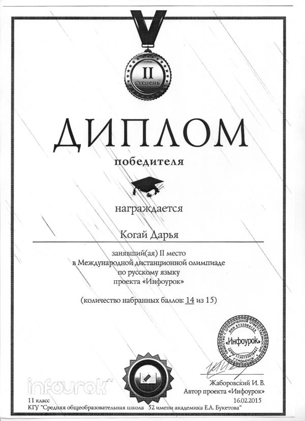 Поздравляем учеников 10-11 классов Кравченко Дарью, Цой Максима, Тен Александру, Когай Дарью, призеров Международной дистанционной олимпиады по русскому языку и литературе проекта "Инфоурок&quo…