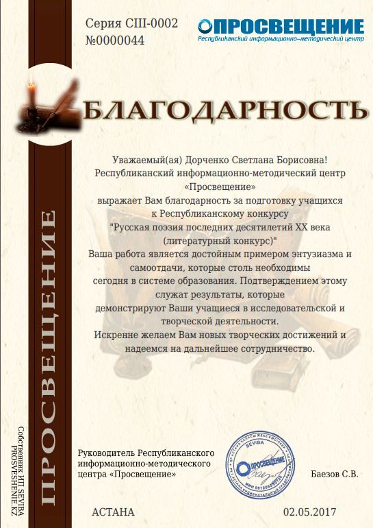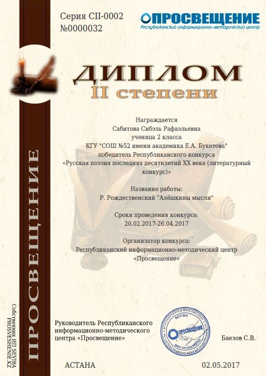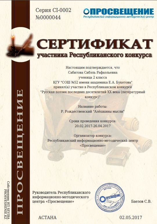 Ученица 2 "А" класса Сабитова Сибэль приняла участие в Республиканском литературном конкурсе "Русская поэзия последних десятилетий XX века" и заняла 2 место! Поздравляем!