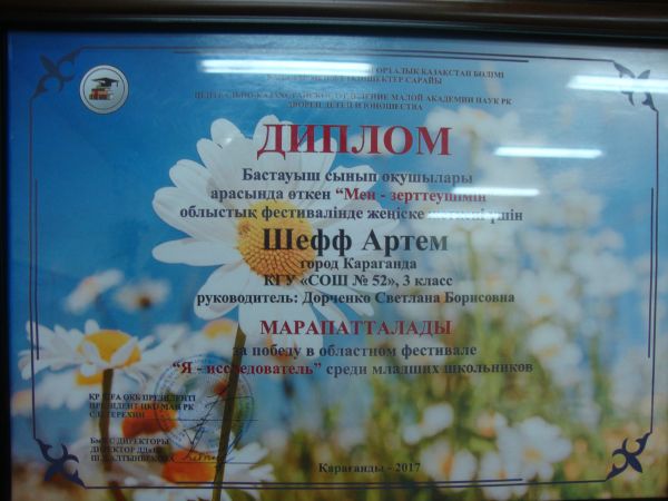 Ученик 3А класса Шефф Артем награжден дипломом за победу в областном фестивале "Я-исследователь"!