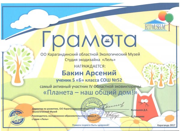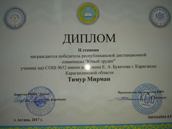 Ученик 4 А класса Мирман Тимур, 2 место в республиканской олимпиаде КИО "Юный эрудит". Молодец!