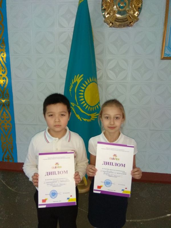 Ученики 4 А класса Жантасов Даулет и Бондаренко Анастасия, заняли 2 место а областной олимпиаде Clever. Поздравляем!