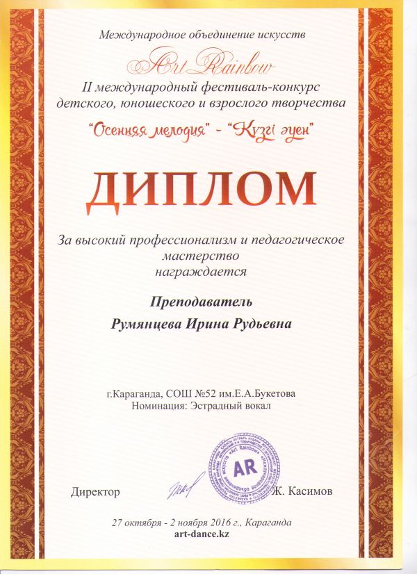 Международное объединение искусств Art Rainbow награждает Кабжанову Зарему дипломом II степени во II международном фестиваль-конкурсе детского, юношеского и взрослого творчества "Осен…