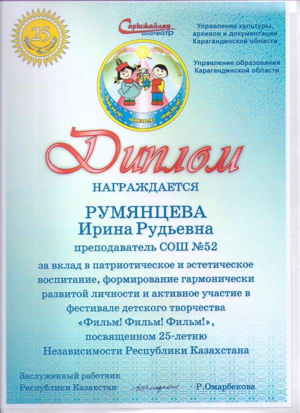 Румянцева Ирина Рудьевна награждается за вклад в патриотическое и эстетическое воспитание, формирование гармонически развитой личности и активное участие в фестивале детского творчества "Фильм!…