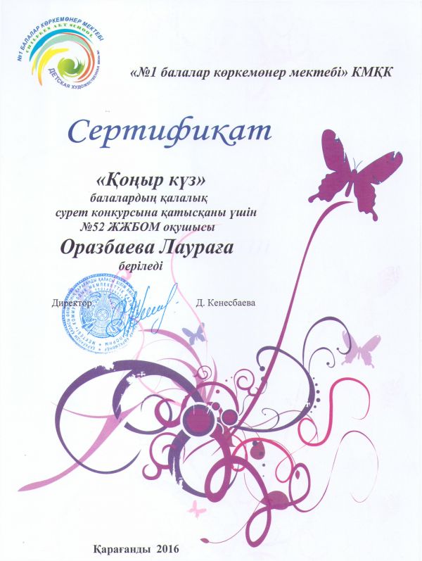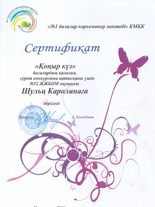 Колесник Анастасия, Оразбаева Лаура, Шульц Каролина, Стефурак Ксения награждаются сертификатами за участие в детском городском конкурсе рисунка "Қоңыр күз".