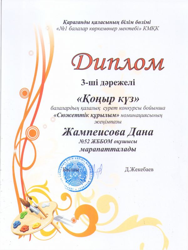Дипломом 3 степени награждается Жампеисова Дана в Детском городском конкурсе рисунка "Қоңыр күз"