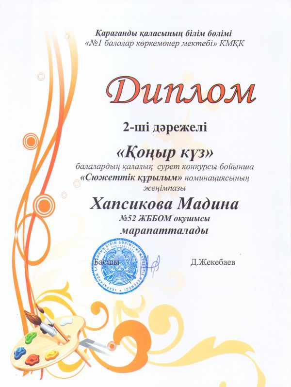 Дипломом 2 степени награждается Капсихова Мадина в Детском городском конкурсе рисунка "Қоңыр күз"