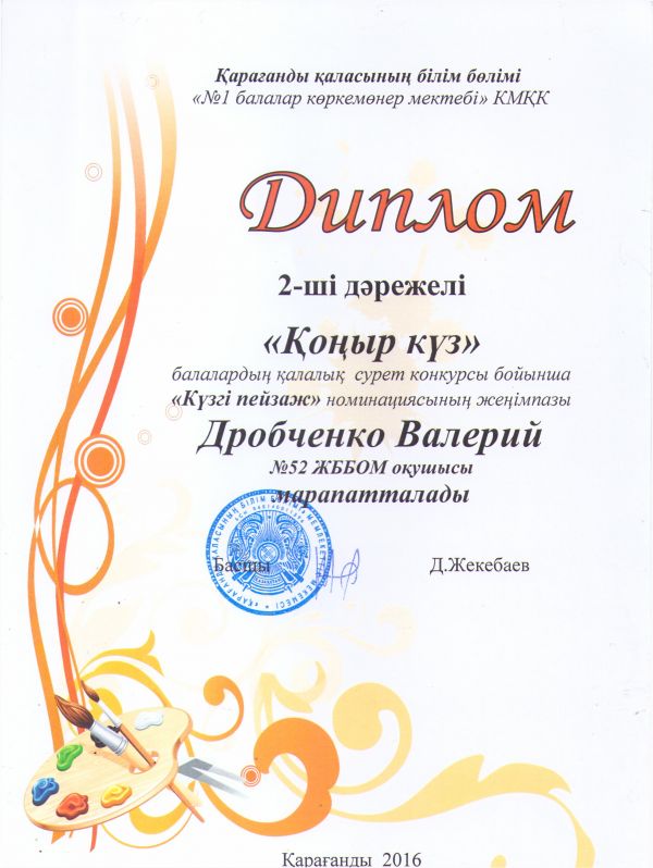 Дипломом 2 степени награждается Дробченко Валерий в Детском городском конкурсе рисунка "Қоңыр күз"