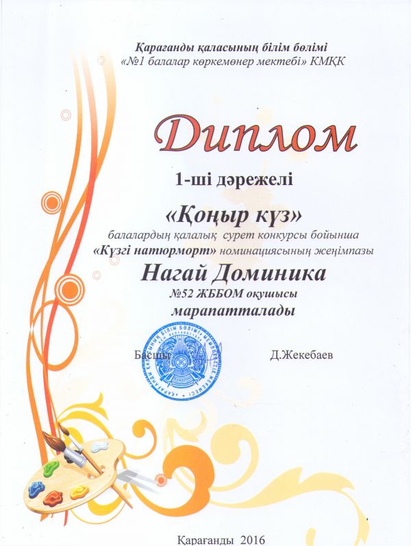 Дипломом 1 степени награждается Нагай Доминика в Детском городском конкурсе рисунка "Қоңыр күз"