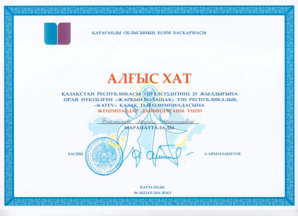 "Жарқын Болашақ" қазақ тіліне арналған олипиадада, "Әнші-бұлбұлдар" облыстық байқауға жеңімпазды дайындағаны үшін Байжанова Марал Манатовна алғыс хатпен марапатталды…