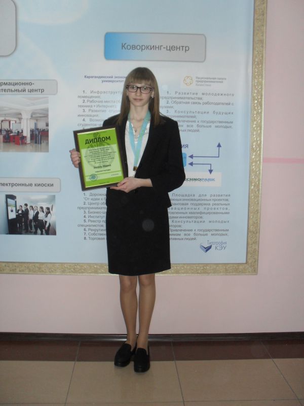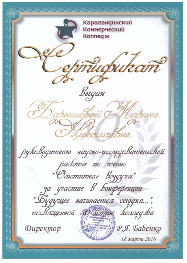 Қарағанды Коммециялық Колледждің 50-жылдығына арналған,""Болашақ бүгіннен басталады" конференциясына қатысқаны үшін, "Очиститель воздуха" тақырыбы бойынша ғылыми-зертт…