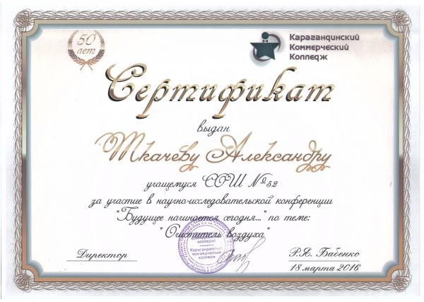 "Очиститель воздуха" тақырыбы бойынша "Болашақ бүгіннен басталады" ғылыми-зерттік конференцияға қатысқаны үшін Ткачева Александраға сертификат берілді.