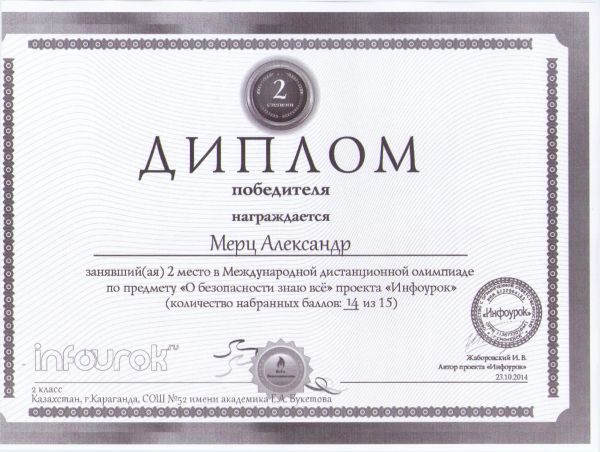 Мерц Александр награждается дипломом победителя за занятое 2 место в Международной дистанционной олимпиаде по предмету "О безопасности знаю все" проекта "Инфоурок"