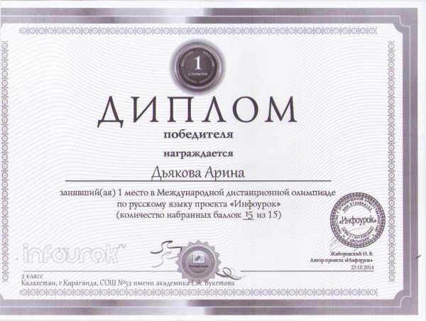 Дьякова Арина награждена дипломом за занятое 1 место в Международной дистанционной олимпиаде по русскому языку проекта "Инфоурок"