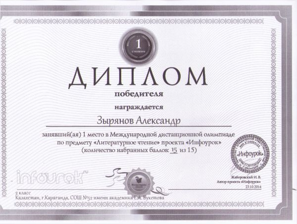 Зырянов Александр награжден дипломом за занятое 1 место в Международной дистанционной олимпиаде по предмету "литературное чтение" проекта "Инфоурок"