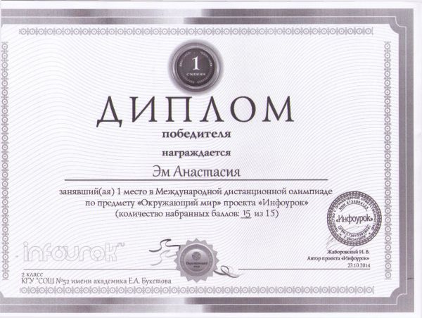 Эм Анастасия награждена дипломом победителя за занятое 1 место в Международной дистанционной олипиаде по проедмету "Окружающий мир" проекта "Инфоурок"