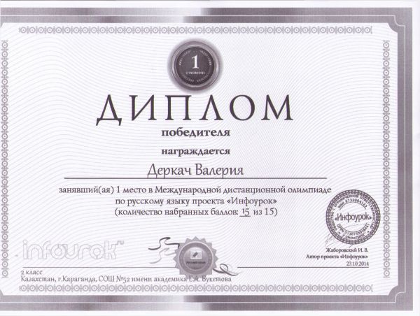 Деркач Валерия награждена дипломом победителя за занятое 1 место в Международной дистанционной олимпиаде по русскому языку проекта "Инфоурок"