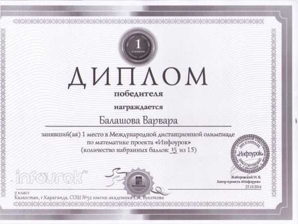 Балашова Варвара награждена дипломом победителя за занятое 1 место в Международной дистанционной олимпиаде по математике проекта "Инфоурок"