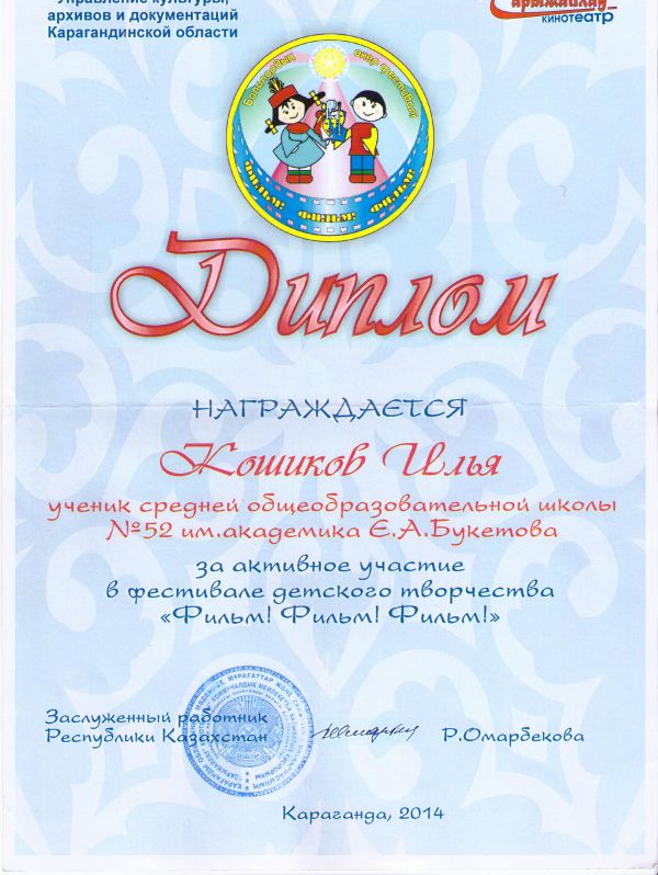 Кошиков Илья награжден грамотой за участие в викторине "Тәуелсіз елім - тірегім", посвященной Дню Независимости Республики Казахстан
