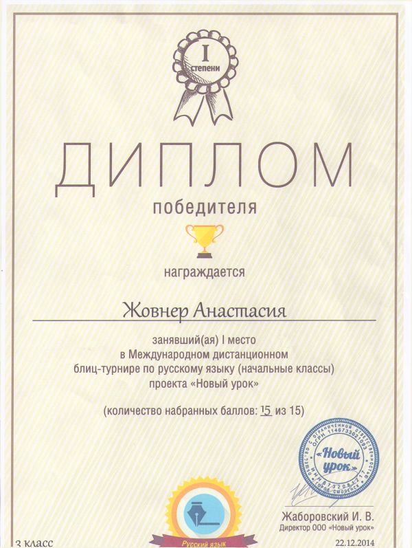 Жовнер Анастасия Награждается дипломом победителя за занятое 1 место в Международном дистанционном блиц-турнире по русскому языку проекта "Новый урок"