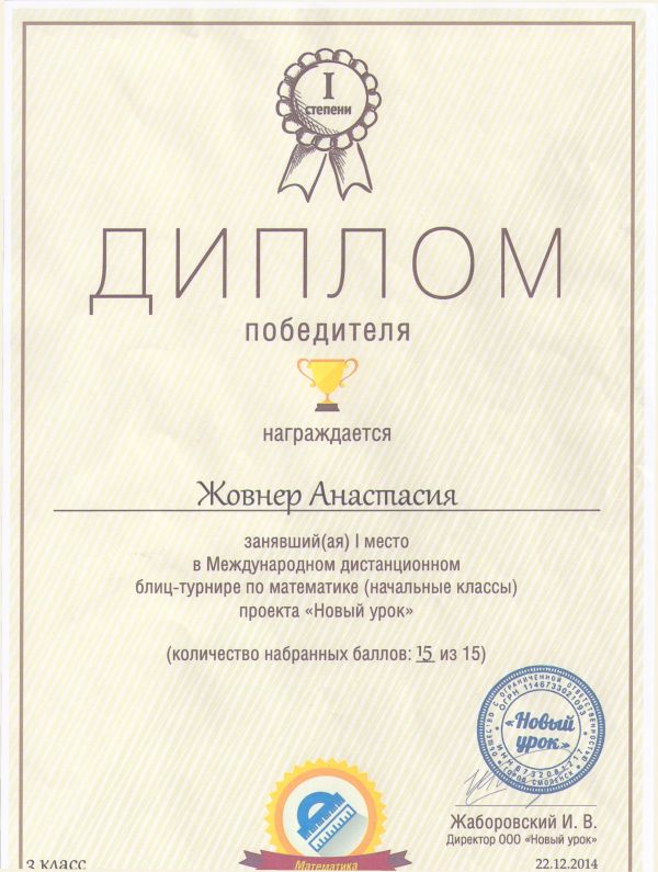 Жовнер Анастасия награждается дипломом победителя за занятое 1 место в Международном дистанционном блиц-турнире по математике проекта "Новый урок"