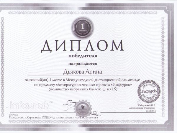Дьякова Арина награждается дипломом победителя за занятое 1 место в Международной дистанционной олимпиаде по предмету "Литературное чтение" проекта "Инфоурок"