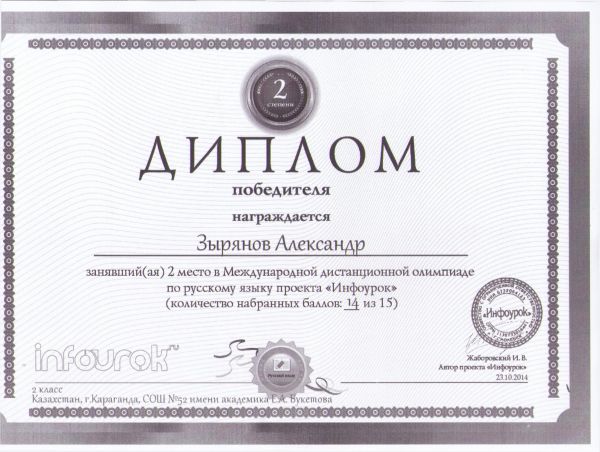 Зырянов Александр награждается дипломом победителя за занятое 2 место в Международной дистанционной олимпиаде по русскому языку проекта "Инфоурок"