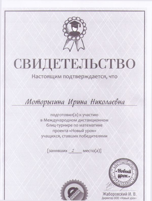 Моторыгина Ирина Николаевна награждена свидетельством за подготовку к участию в Международном дистанционном блиц-турнире по математике проекта "Новый урок" учащихся, ставших победителями