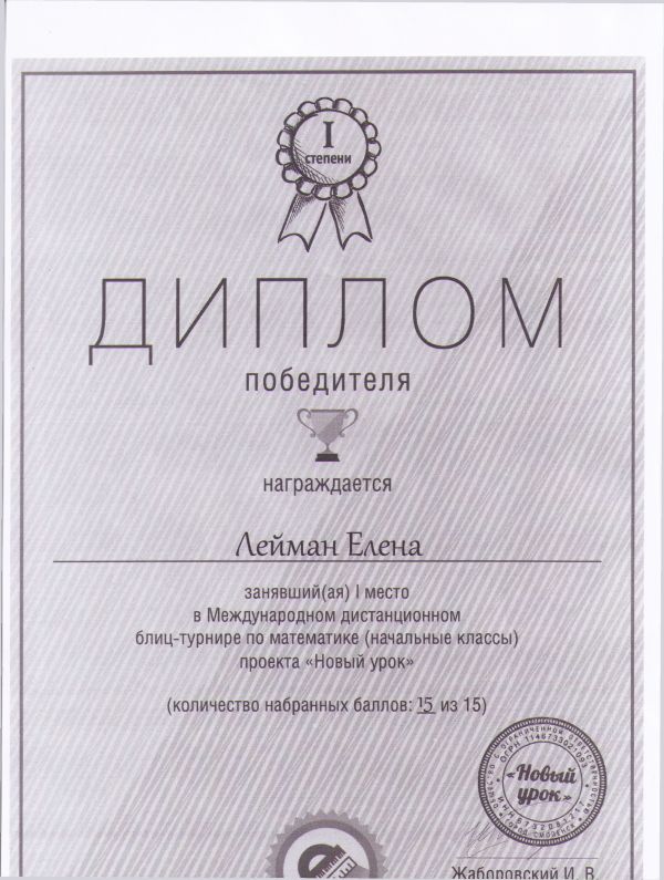Лейман Елена награждена дипломом победителя за занявшее 1 место в Международном дистанционном блиц-турнире по математике проекта "Новый урок"