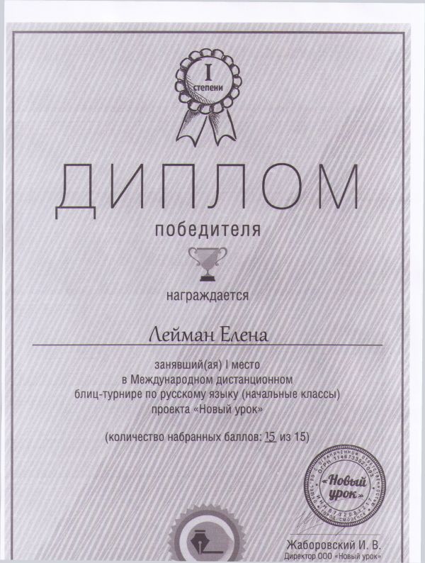 Лейма Елена награждена дипломом победителя за занявшее 1 место в Международном дистанционном блиц-турнире по русскому языку проекта "Новый урок"