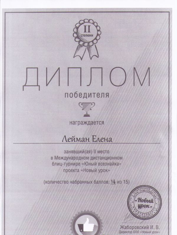 Лейман Елена награждена дипломом победителя за занявшее 2 место в Международном дистанционном блиц-турнире "Юный всезнайка" проекта "Новый урок"