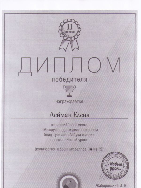 Лейман Елена награждена дипломом победителя за занявшее 2 место в Международном дистанционном блиц-турнире "Азбука жизни" проекта "Новый урок"