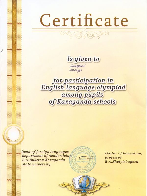 Смагулов Мансур награжден сертификатом за участи в олимпиаде по английскому языку среди учеников школ Караганды