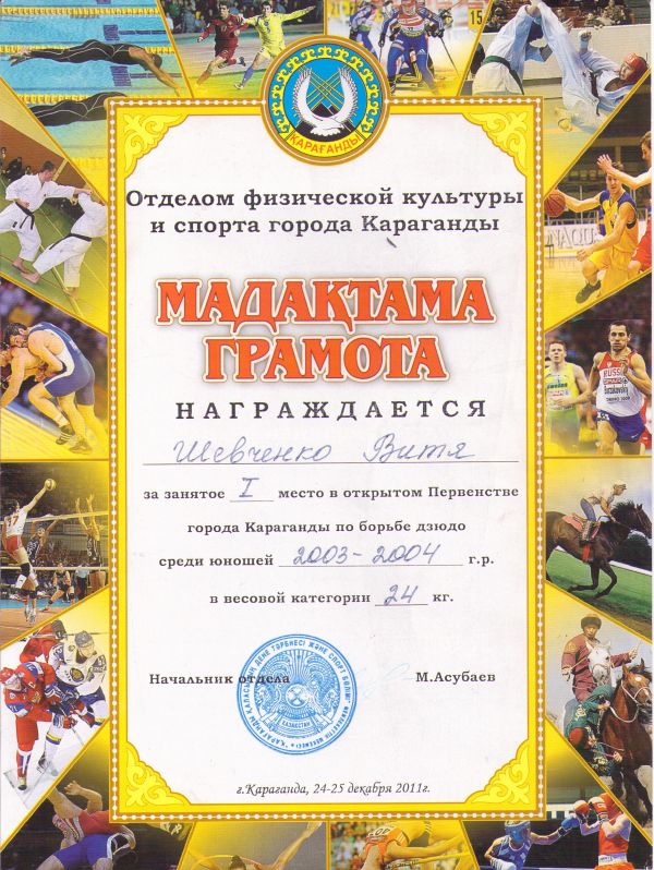 Шевченко Витя награждается грамотой за занятое 1 место в открытом Первенстве города Караганды по борьбе дзюдо среди юношей 2003-2004 года рождения