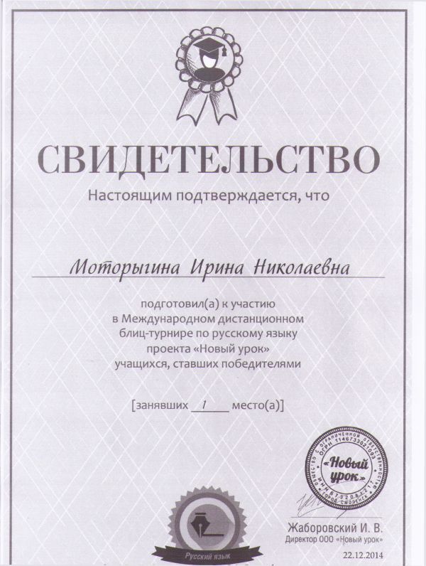 Моторыгина Ирина Николаевна награждена Свидетельством за подготовку к участию в Международном дистанционном блиц-турнире по русскому языку проекта "Новый урок" учащихся, ставших победителя…
