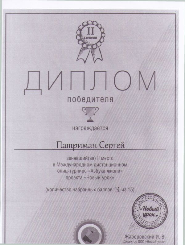 Патриман Сергей награжден дипломом победителя за занявшее 2 место в Международном дистанционном блиц-турнире "Азбука жизни" проекта "Новый урок"