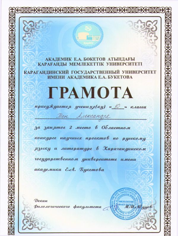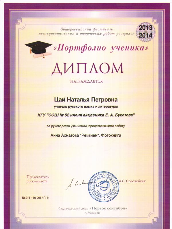 11 А сынып окушысы Тен Алексей зерттеушілік және шығармашылық жалпыресейлік фестиваль жұмыстарындағы "Оқушының портфолиосы" дипломымен марапатталды. "Бірінші қыркүйек" баспа…