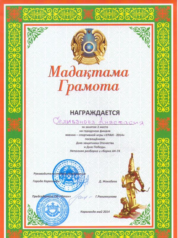 Академик Е.А. Букетов атындағы №52 ЖББОМ Жеңіс күніне және Отанды Қорғау Куніне арналған "ҰЛАН-2014" әскери-спорттық ойыны қалалық финалға қатысты.