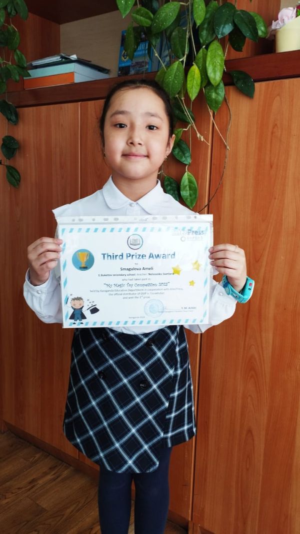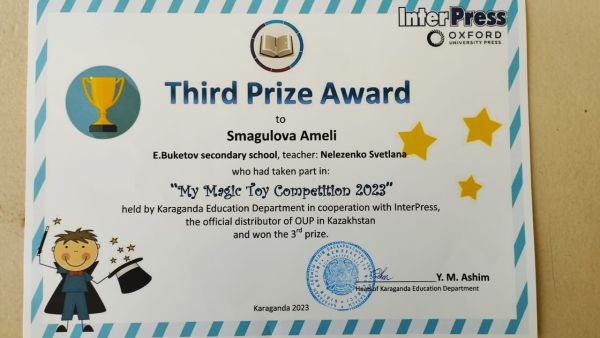 Ученица 2 А класса Смагулова Амели заняла 3.место в городском творческом конкурсе видео проектов для учащихся 2-4 классов "My magic toy". Руководитель - учитель английского языка - Н…