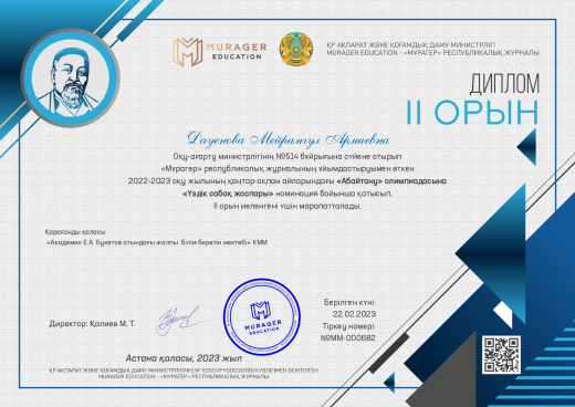 Біздің мектептің қазақ тілі мен әдебиеті мұғалімі Дауенова Мейрамгул Армиевна "Мұрагер" ғылыми-әдістемелік журналы жалпы орта білім беру ұйымдарының ұстаздарын 2022-2023 оқу жы…