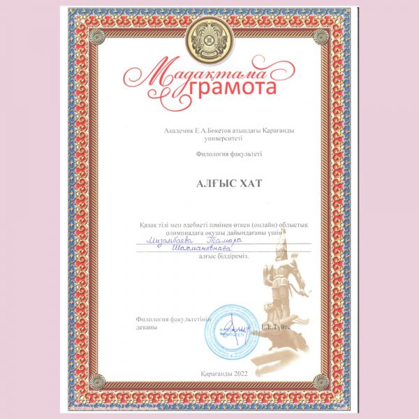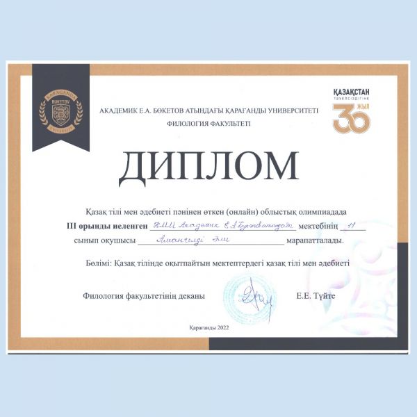 Е.А.Бөкетов университетінде филология факультетінде өткен облыстық олимпиадада 11"Б"сынып оқушысы Амангелді Әли III орынды иеленді. Жетекшісі: Мизамбаева Т.Ш.
