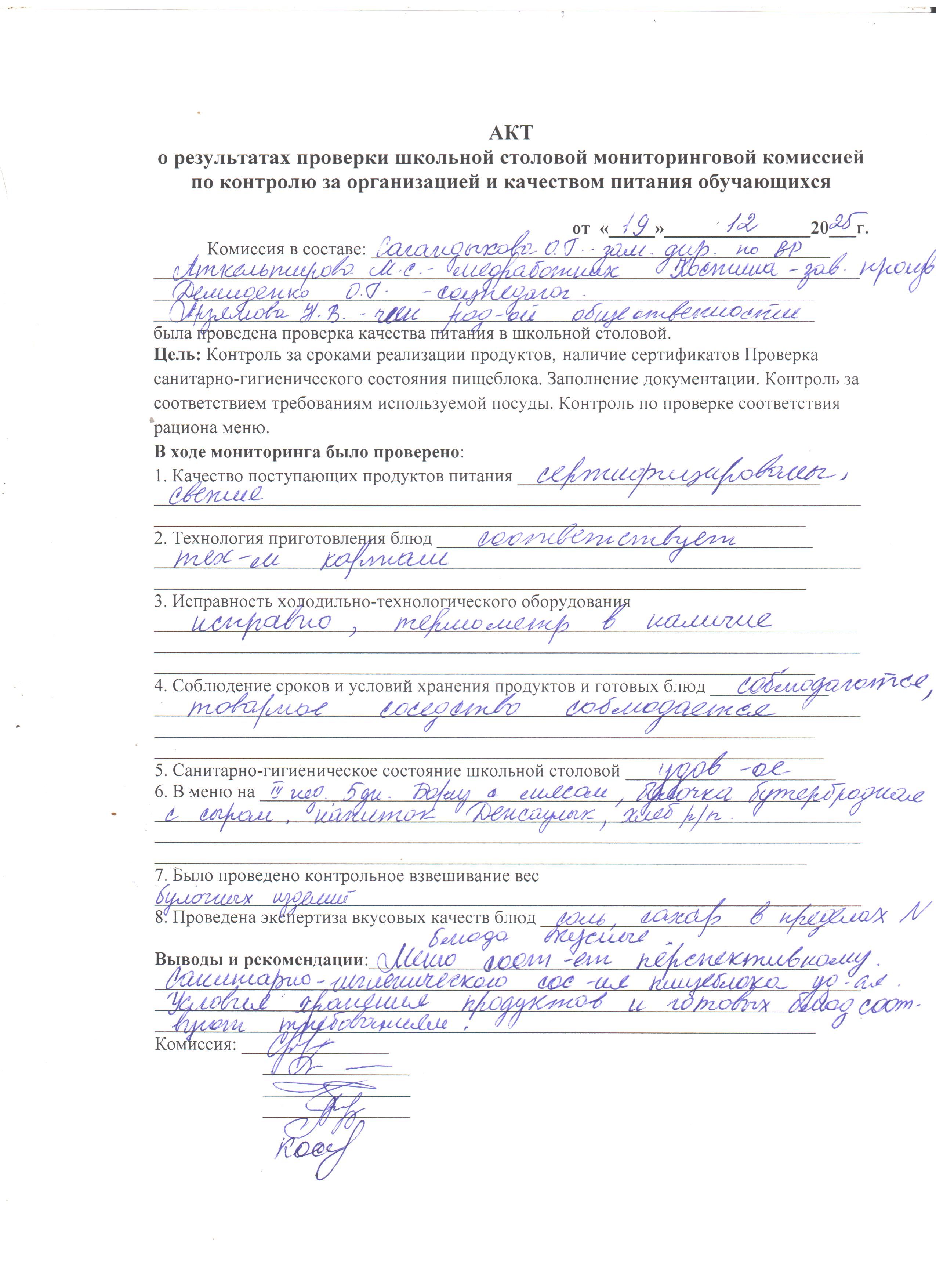 19.12.2025. Прошла очередная проверка школьного пищеблока мониторинговой группой. Столовая работает в штатном режиме, персонал добросовестный.