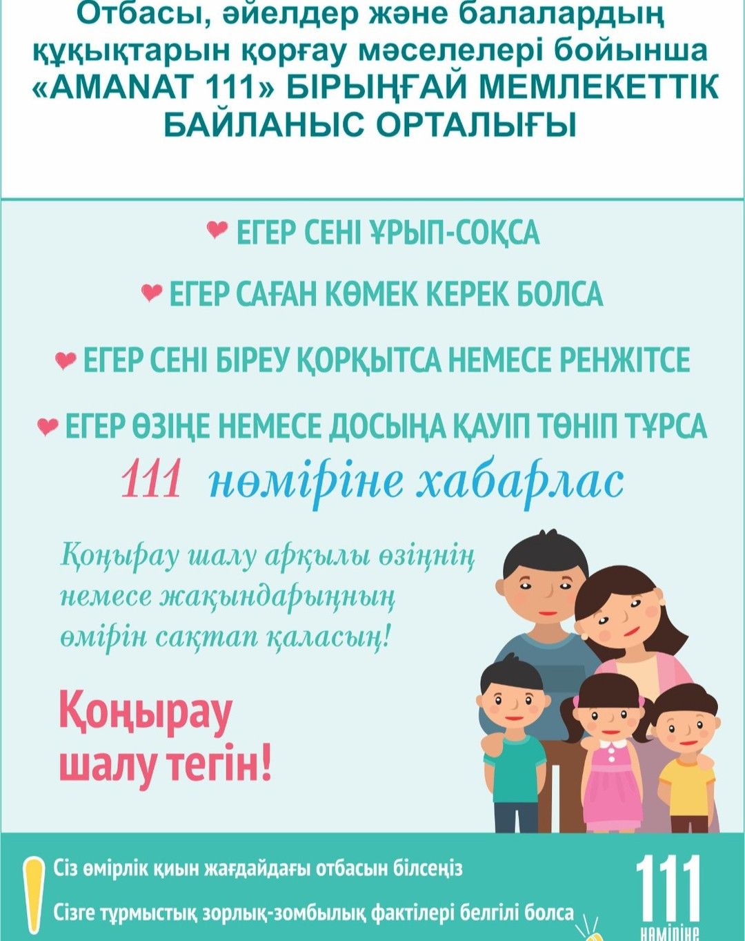 Единый государственный контакт-центр "111 Аманат" по вопросам семьи, женщин и защиты прав детей.