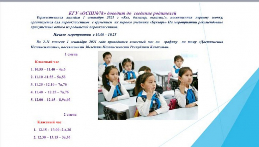1 сентября 2021 года в стенах ОСШ №78 состоится торжественная линейка для первоклассников. На мероприятии рекомендовано присутствие одного из родителей.