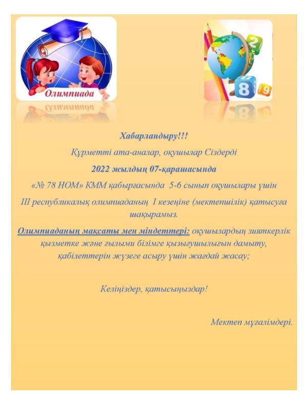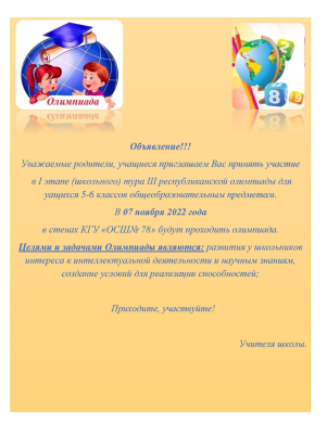 Уважаемые родители, учащиеся приглашаем Вас принять участие в I (школьного) этапа республиканской олимпиады школьников по 15 общеобразовательным предметам, который будет организован…
