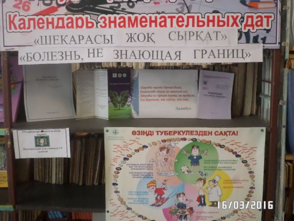 Мектептің кітапханашысы Карсакина Г.В. дүниежүзілік туберкулезбен күрес күні аясында "Шегі жоқ сырқат" тақырыбында тақырыптық көрме ұйымдастырды.