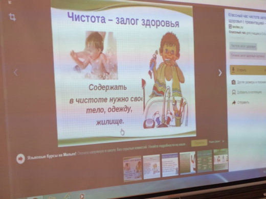 Сеодня в 3 "а" классе был классный час на тему "Чистота-залог здоровья". Цель: воспитывать у детей потребность к здоровому образу жизни, дать понятие  слову гигиена.